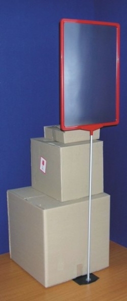 Ramka z tworzywa sztucznego z kieszenią foliową (pionowa lub pozioma), mocowana do nogi za pośrednictwem adaptera, noga aluminiowa anodowana na kolor srebrny-mat, podstawa stalowa prostokątna o wym 160x175mm, lakierowana na kolor czarny.